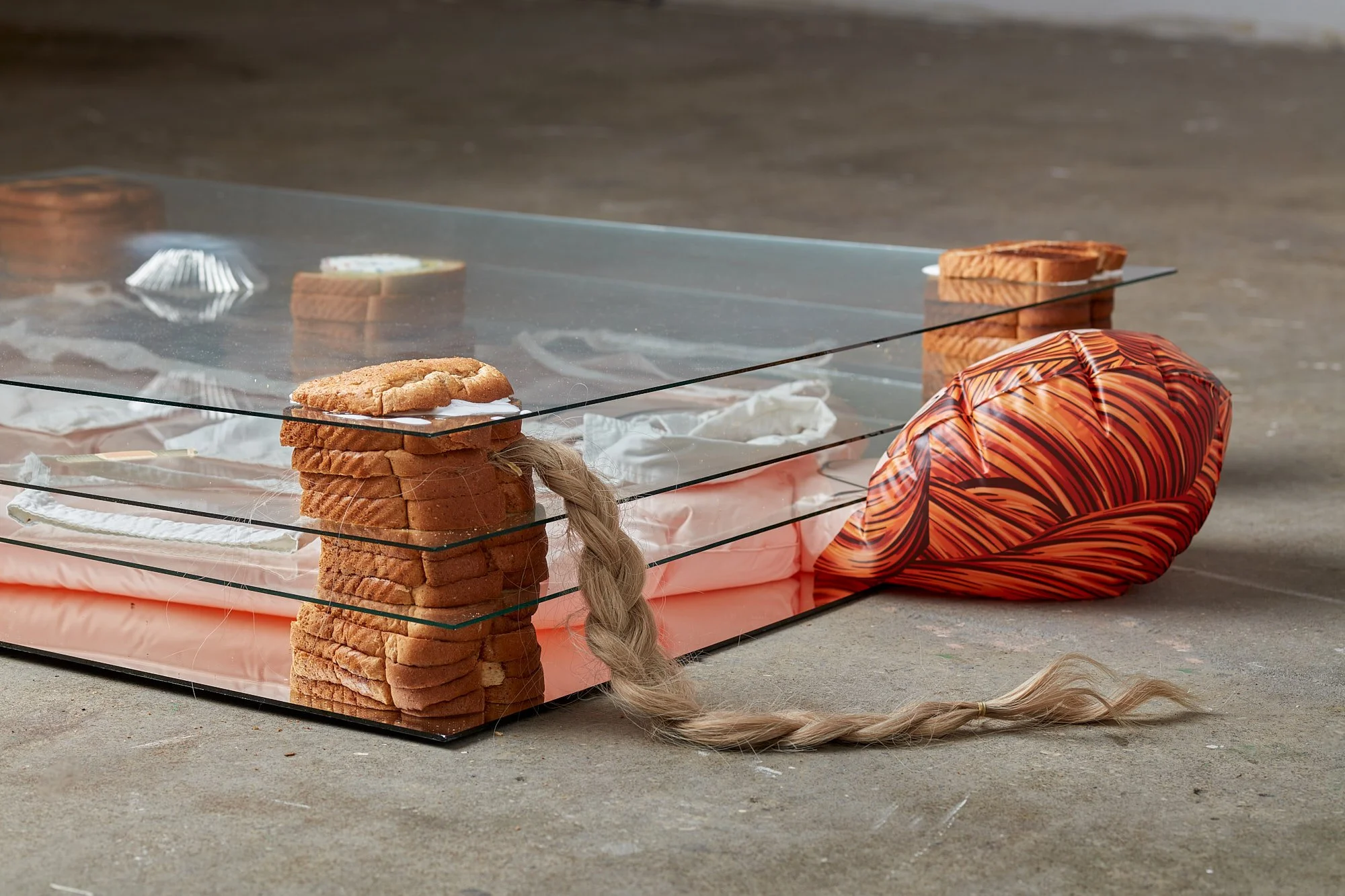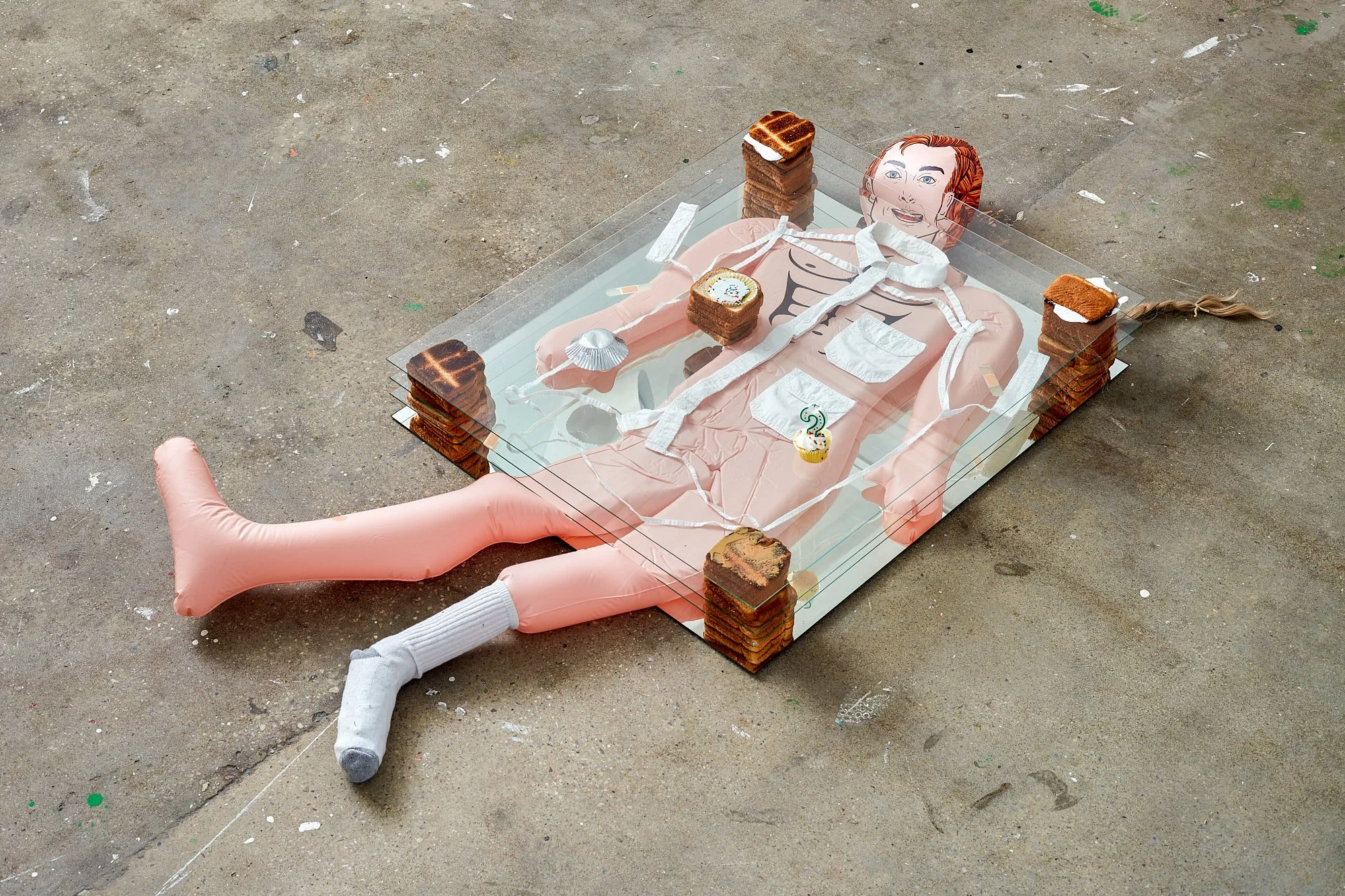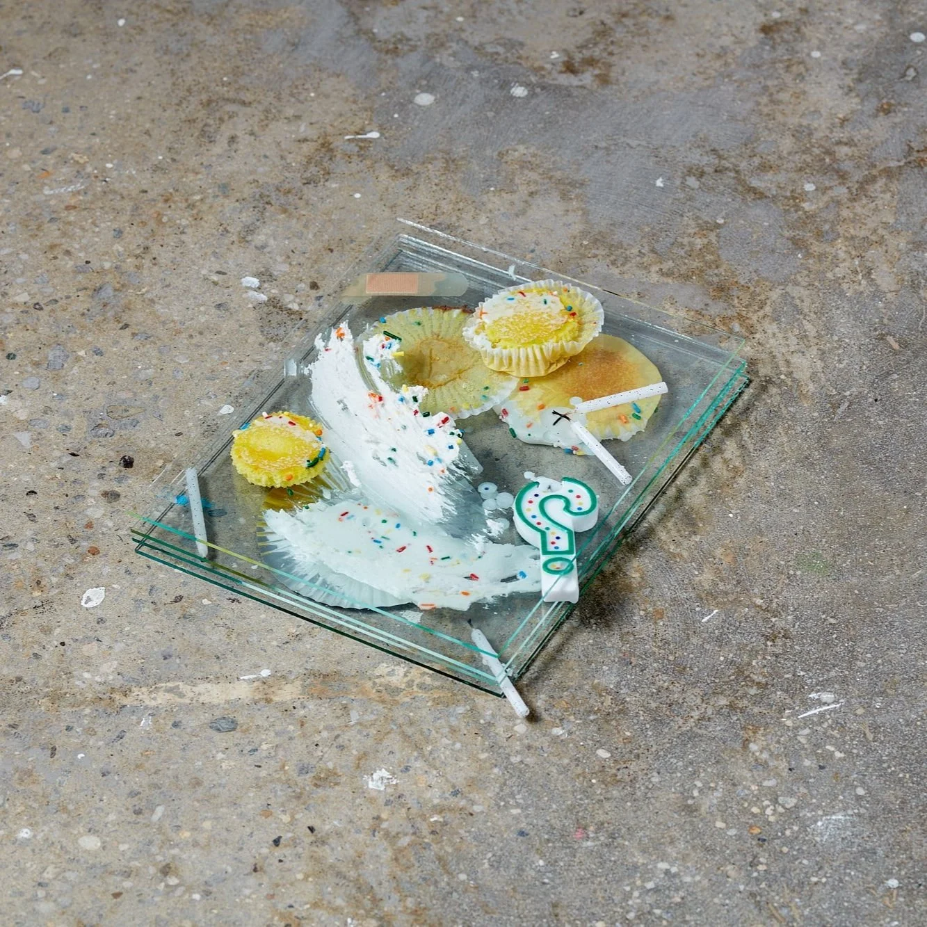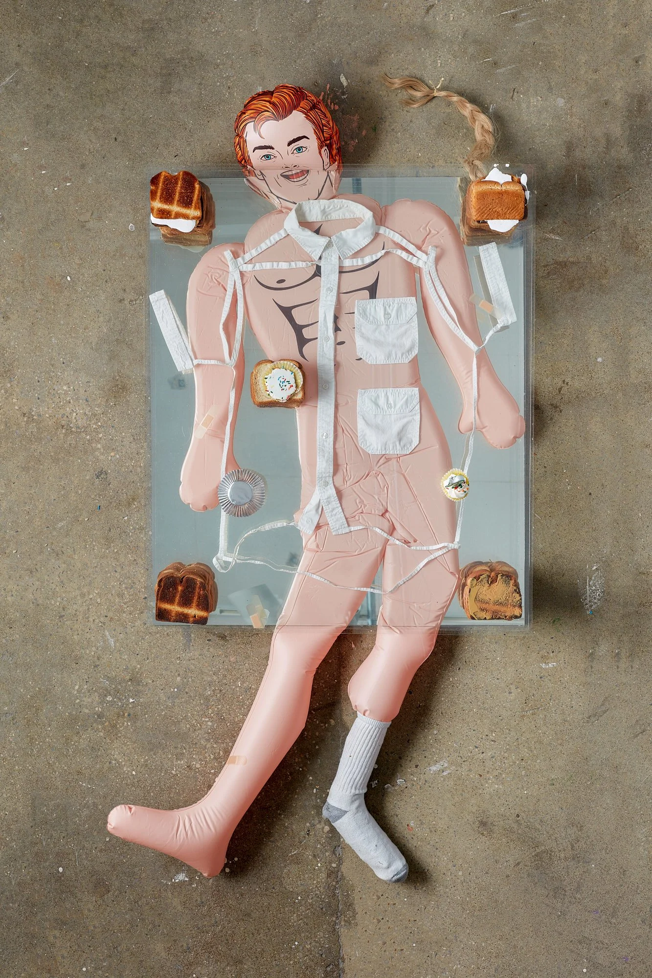 glass, blow up doll, white bread, peanut butter, jelly, fluff, cupcake, candle, collared shirt, used sock, blond wig, detritus