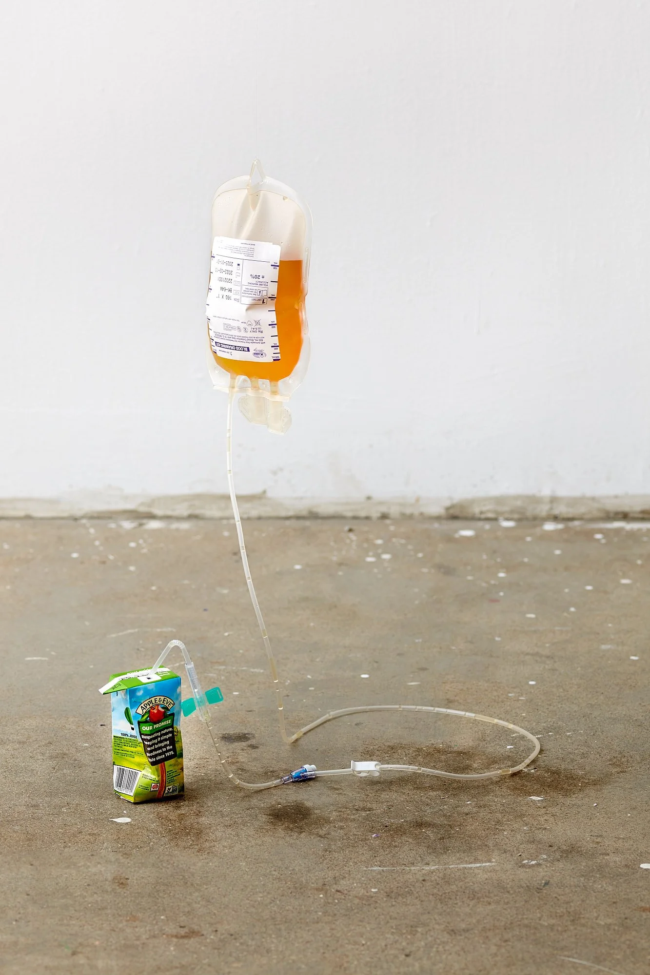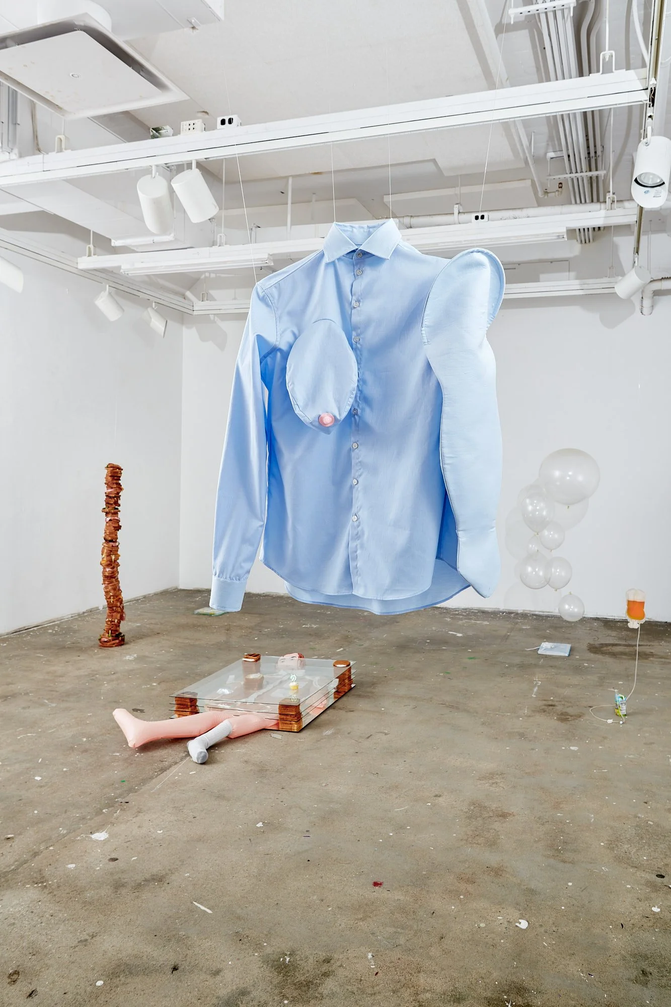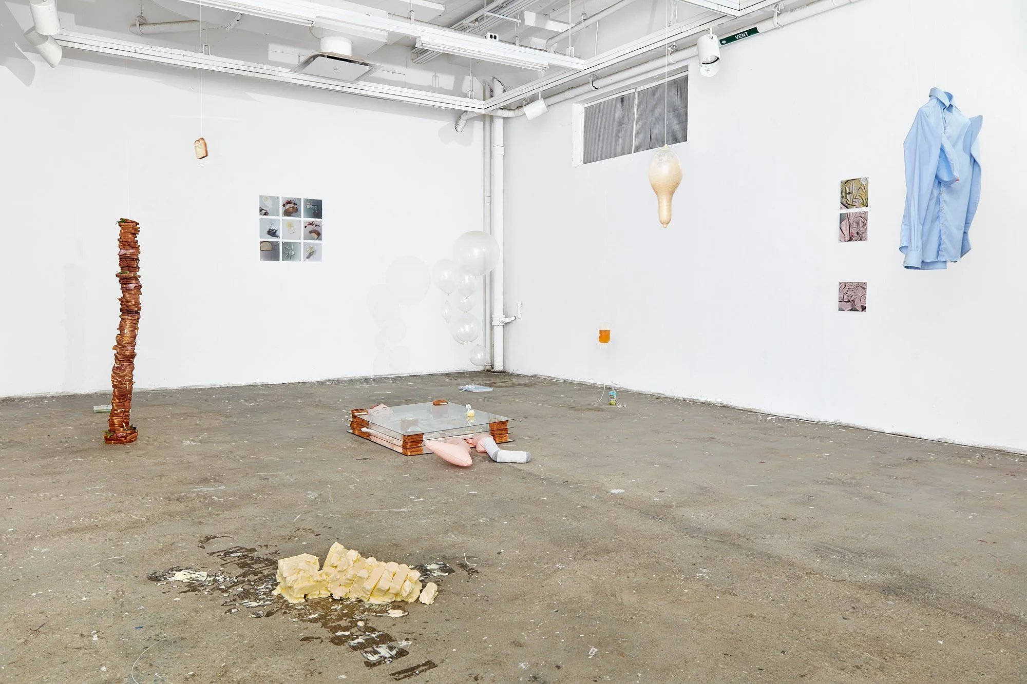 glass, blow up doll, white bread, peanut butter, jelly, fluff, cupcake, candle, collared shirt, used sock, blond wig, detritus