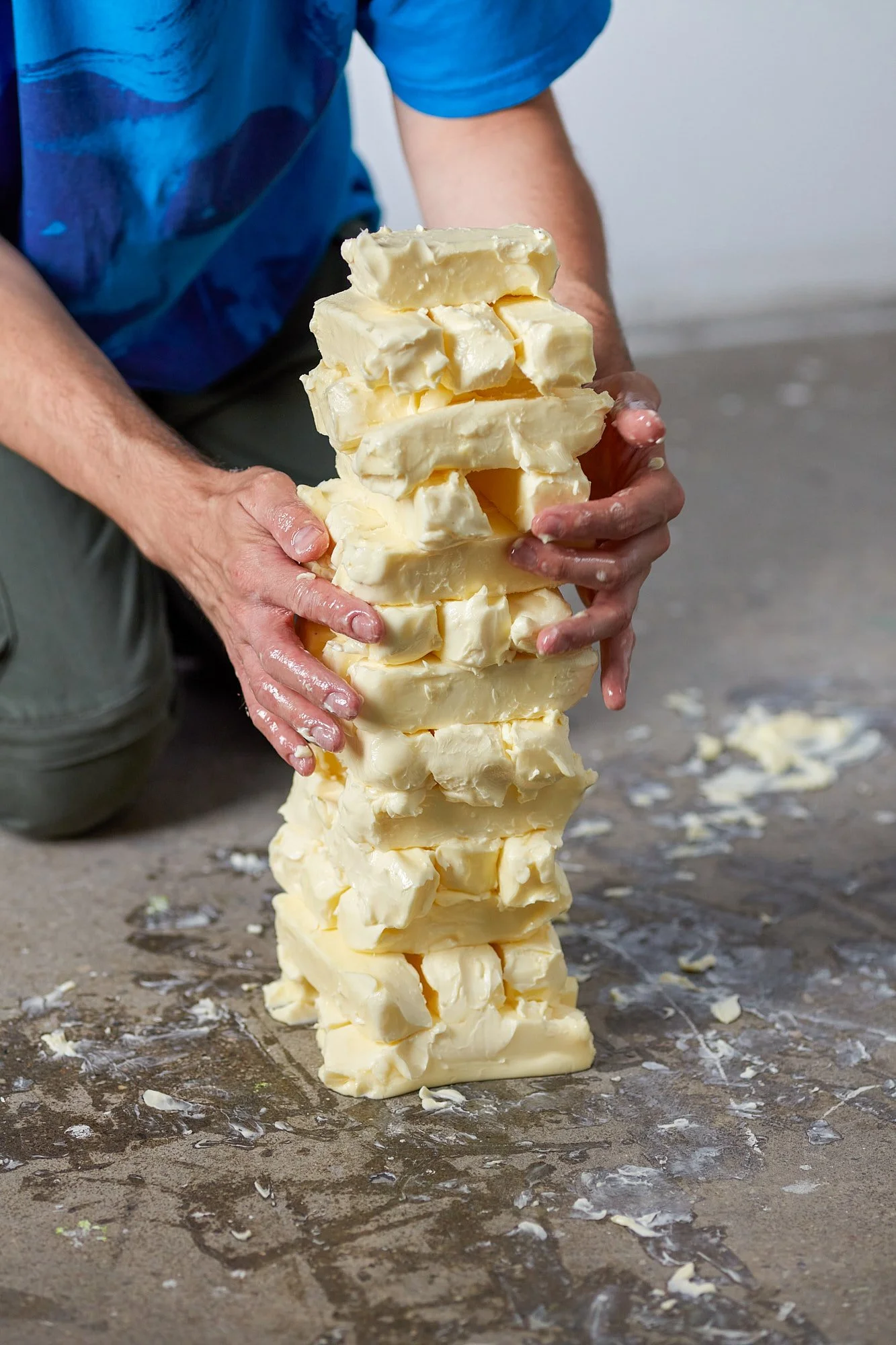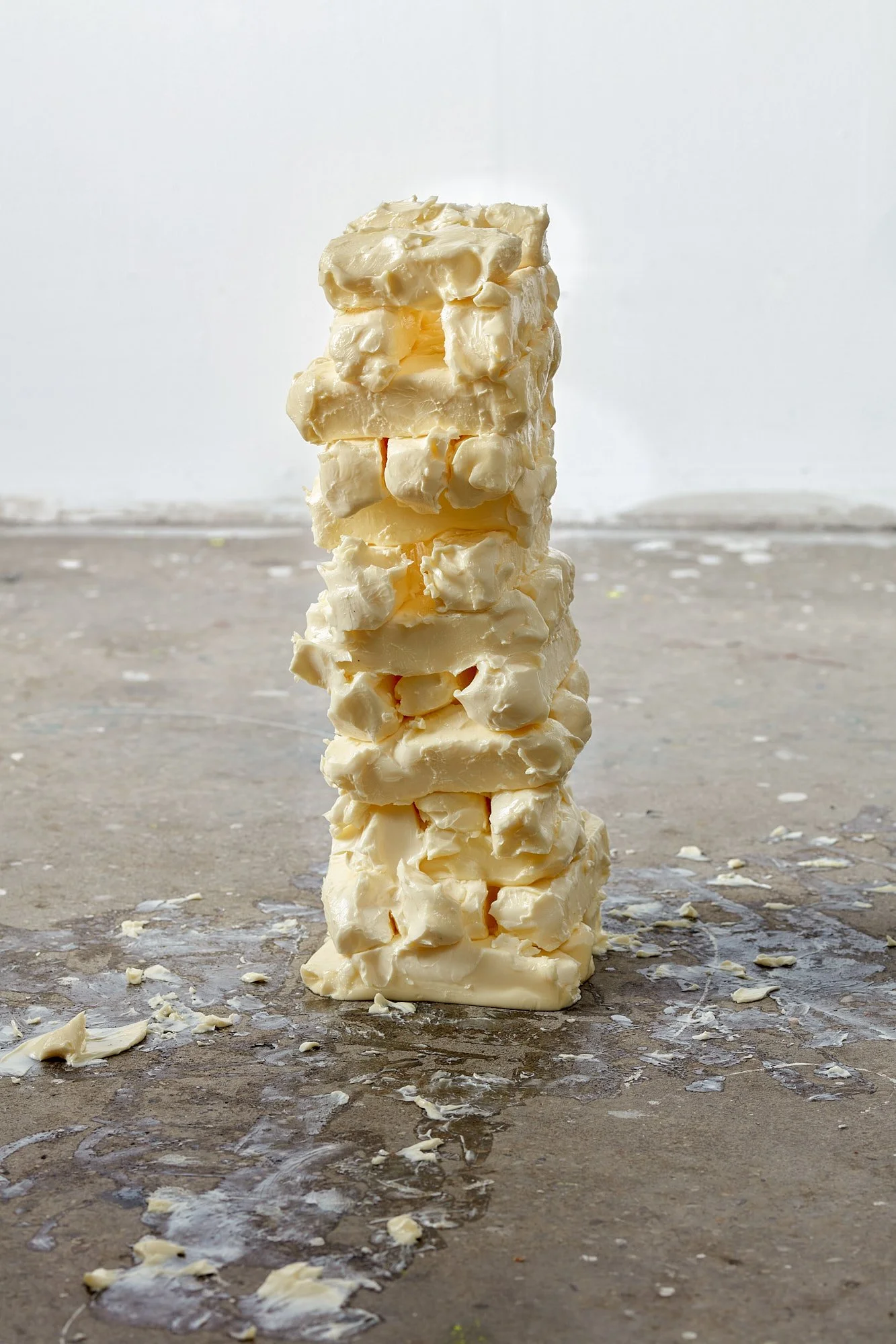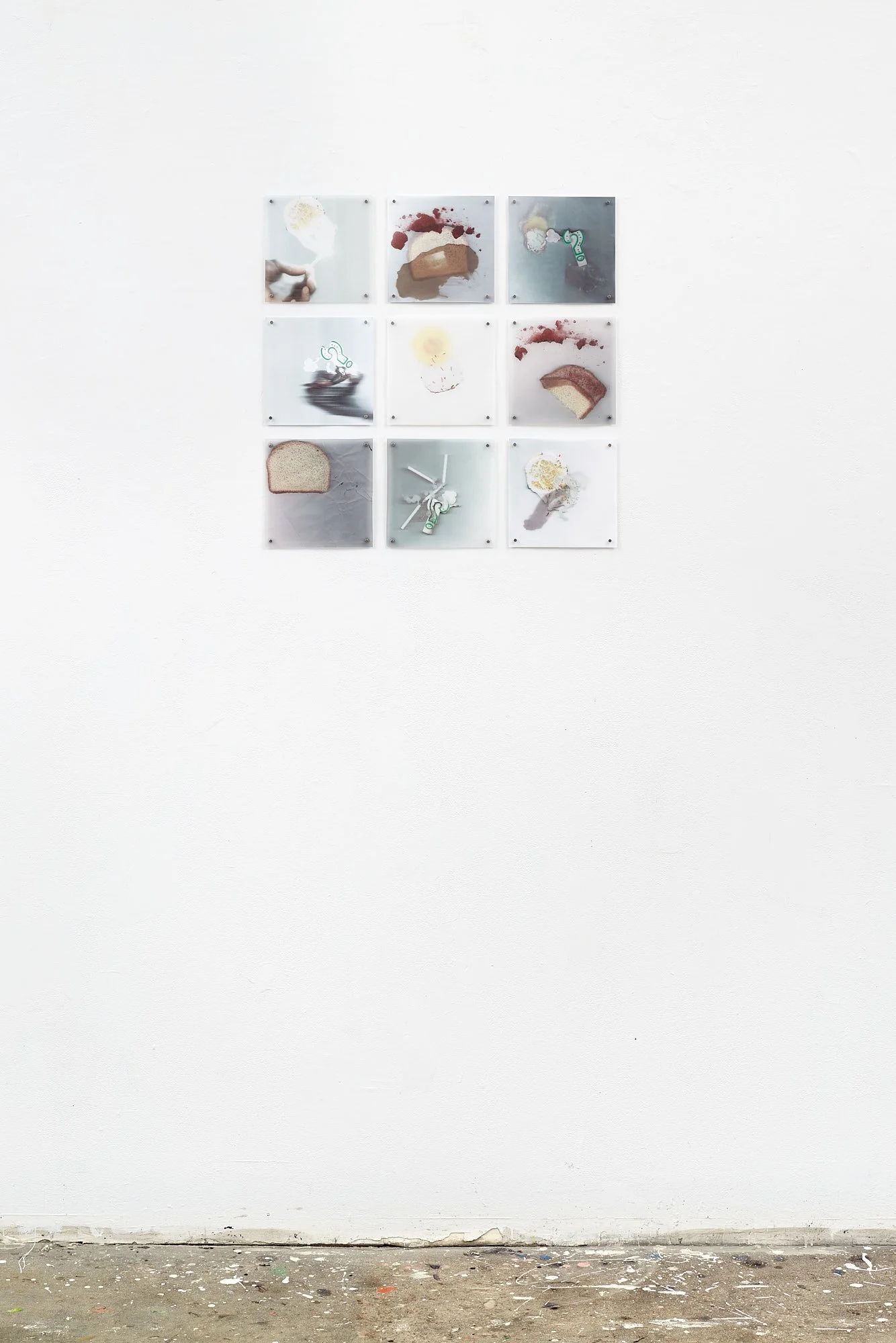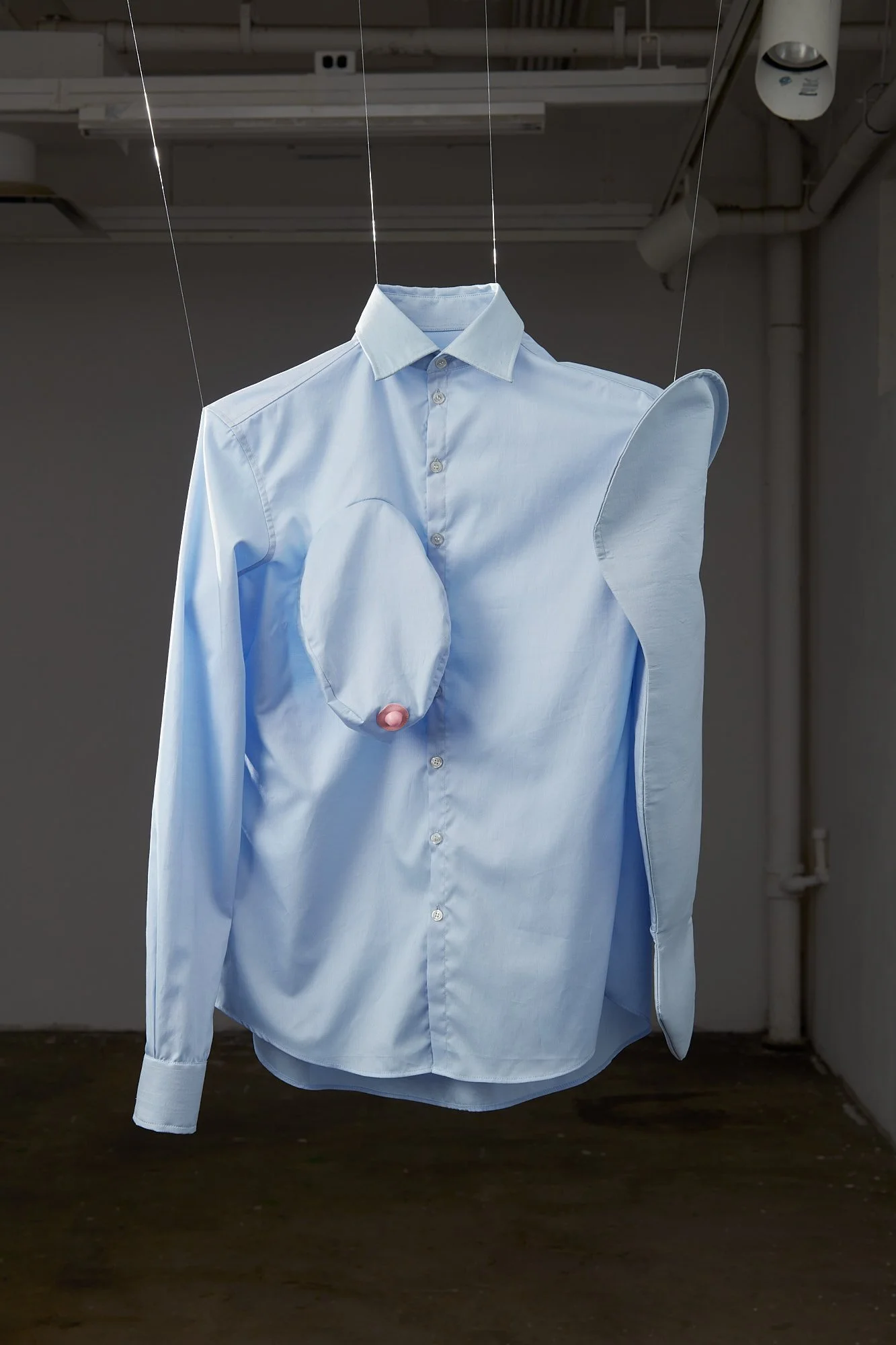 glass, blow up doll, white bread, peanut butter, jelly, fluff, cupcake, candle, collared shirt, used sock, blond wig, detritus