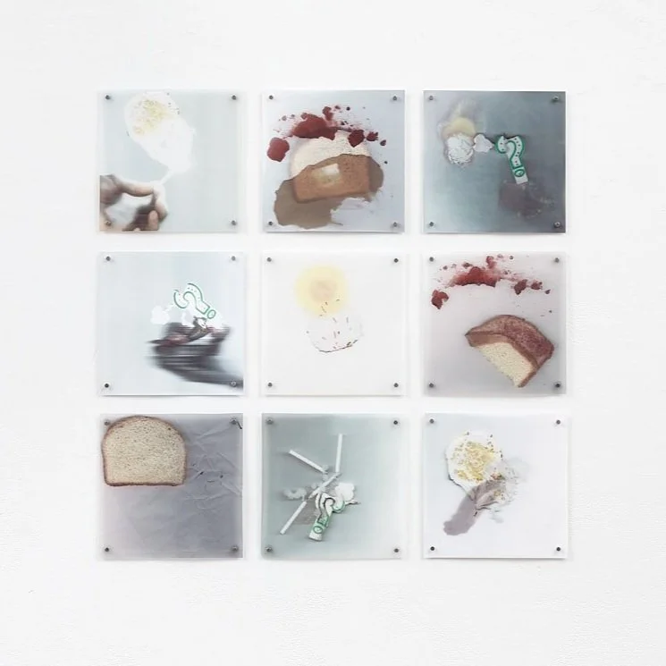 white bread, ziploc bag, cotton thread, fabric covered buttons